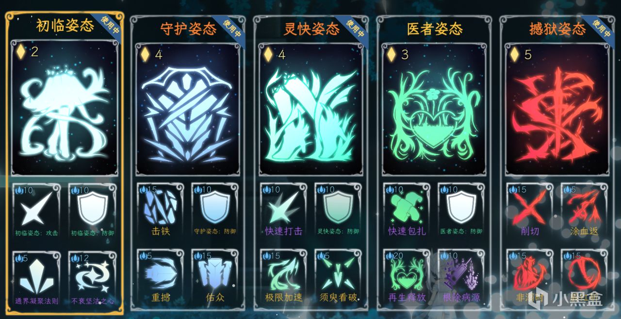 “姿态”可以理解为职业,玩家在战斗中可以根据需求自由切换姿态(最多可以同时配置四个姿态)。进入战斗后,默认无姿态(当然,有些心得直接xx姿态开局)。每个姿态会有对应技能组的四个技能,玩家可以消耗决意点来进入对应姿态,获得姿态的额外属性加成和姿态的技能组。姿态有持续时间,可提前结束,也就是说玩家可以一回合进入多次姿态。