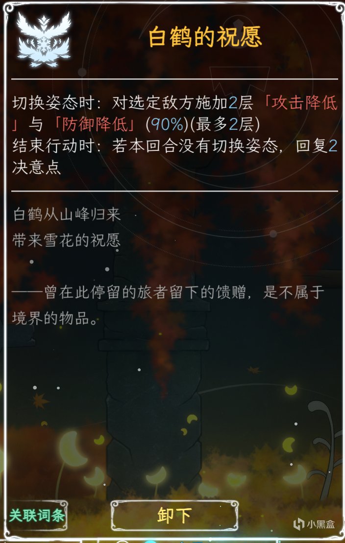 3容量的白鹤的祝愿,切换姿态可以降低敌人大量攻击值和防御值,回合内没有切换姿态还可以额外回复决意点,我个人比较喜欢放在最后一个格子的心得;