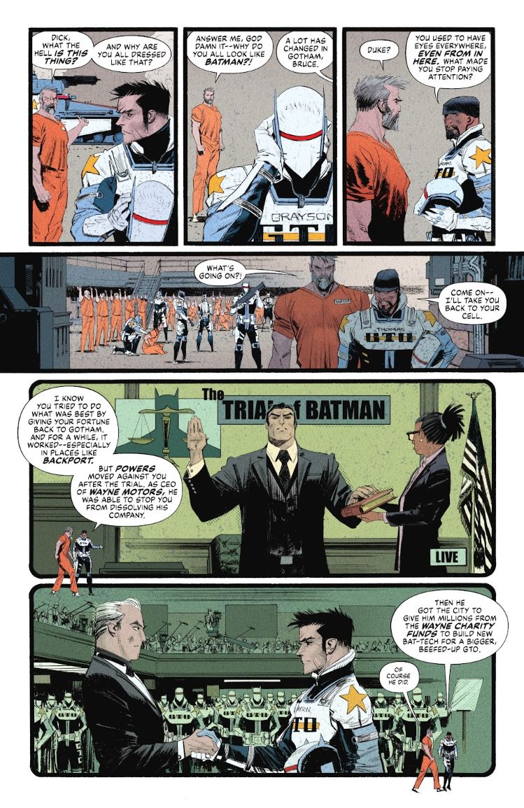 而老爺所在的監獄則又一次發生了暴動,在老爺威懾並平息暴動人羣后,一個新的名爲GTO的鎮暴組織登場,迪克與杜克都是這個組織的“執行者”,他們比普通警察更加全副武裝、並且手段暴力,而老爺顯然已經不問世事多年,由杜克給其補了一下目前的哥譚形式。