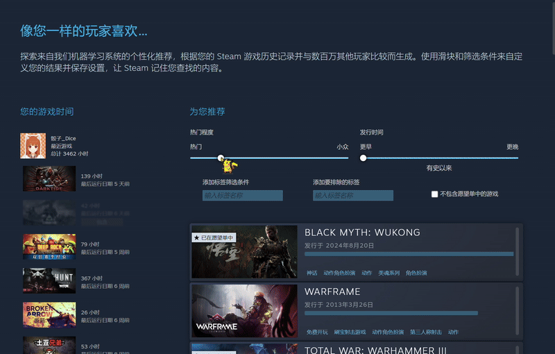 可以查看Steam库里各款游戏的游玩情况,然后利用机器学习推荐自己可能会喜欢的游戏。比较方便的一点是可以调整热门程度和上架时间的权重改编推荐序列。