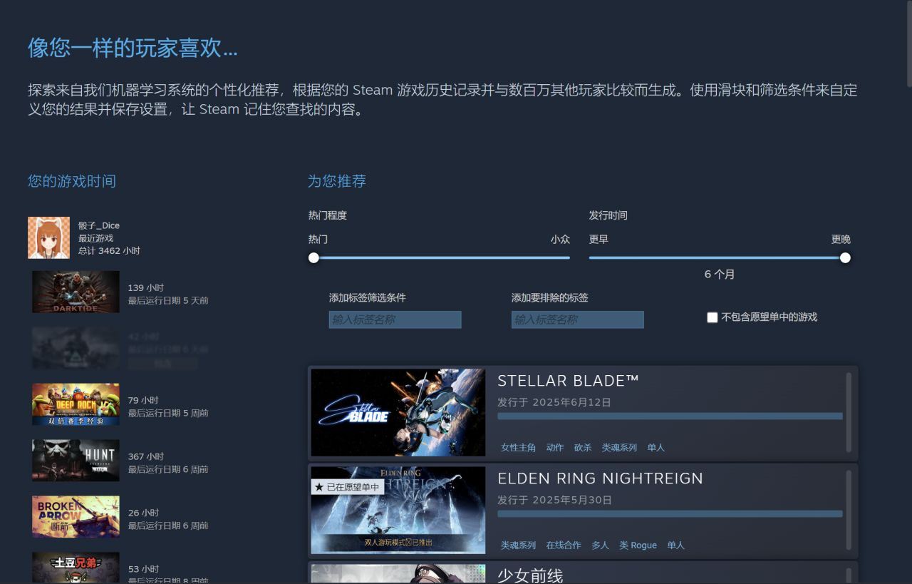 可以调整热门程度,发行时间,添加和删除特定标签和选择是否推荐已加入愿望单的游戏。