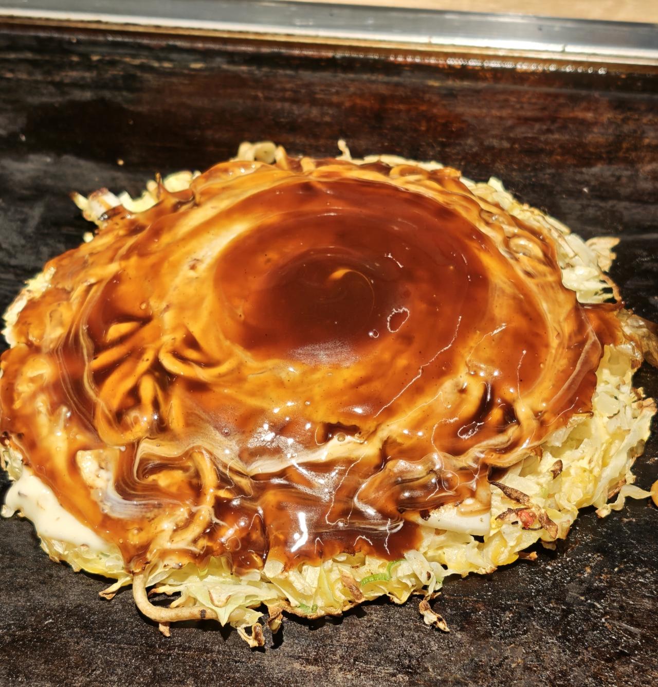 雖然叫大阪燒,但是在各個城市都能喫到在鐵板上煎帶麪醬的蔬菜,也可以自選加入麪條或者各種海鮮肉類,最後淋上醬汁,印象中是類似甜麪醬的味道