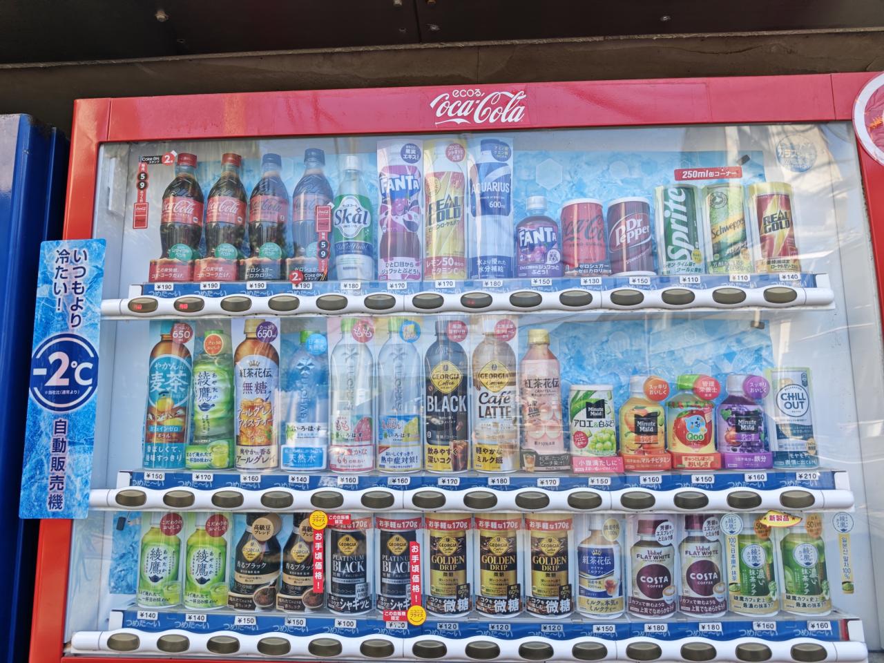 自動售貨機很多,礦泉水和飲料價格通常差不多,大多都在100~200y之間。在超市購買飲品會比自動售貨機更便宜。自動售貨機內的價格可以參考下圖。