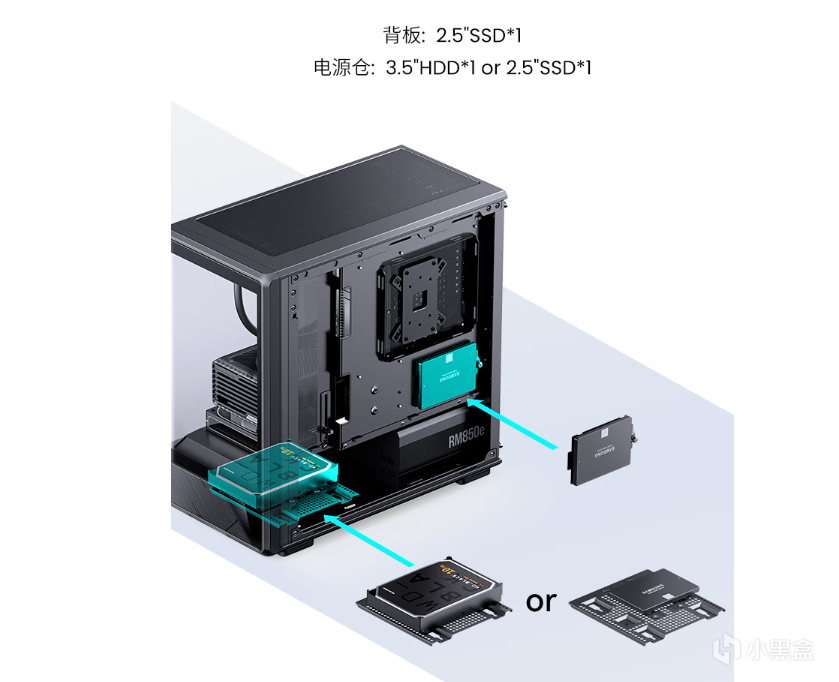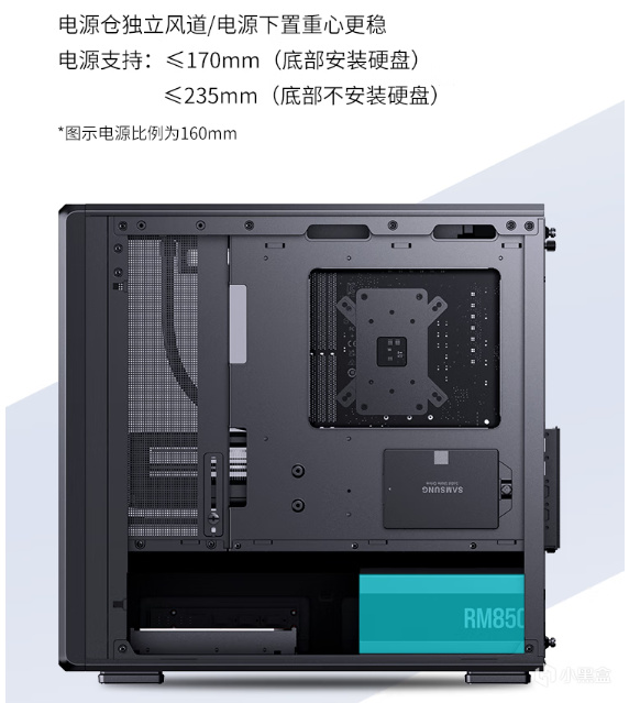 底仓支持170mm长度ATX电源,搭配可调硬盘架提供灵活存储方案