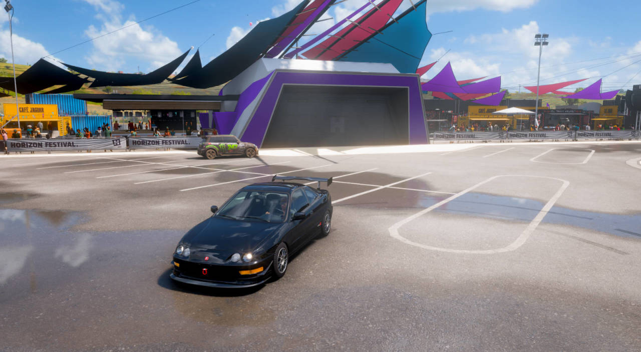 在地平線街頭賽前哨站拍攝任意高性能掀背車(車庫篩選高性能掀背車)的相片,位置如圖,完成獎勵爲“塗鴉鴨舌帽”服飾獎勵