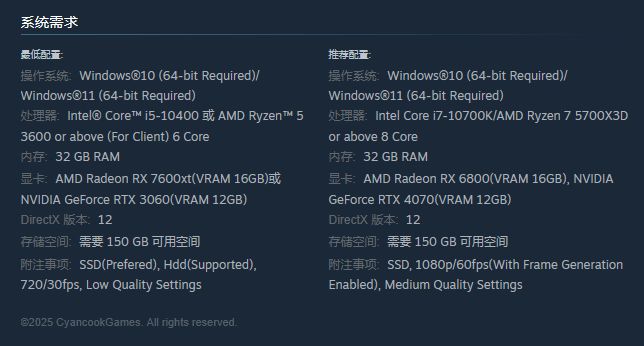 游戏同时也公开了Steam界面和配置要求。不过,由于游戏尚处在宣传阶段,因此下列配置要求仍有打磨优化空间,请大家理性看待。