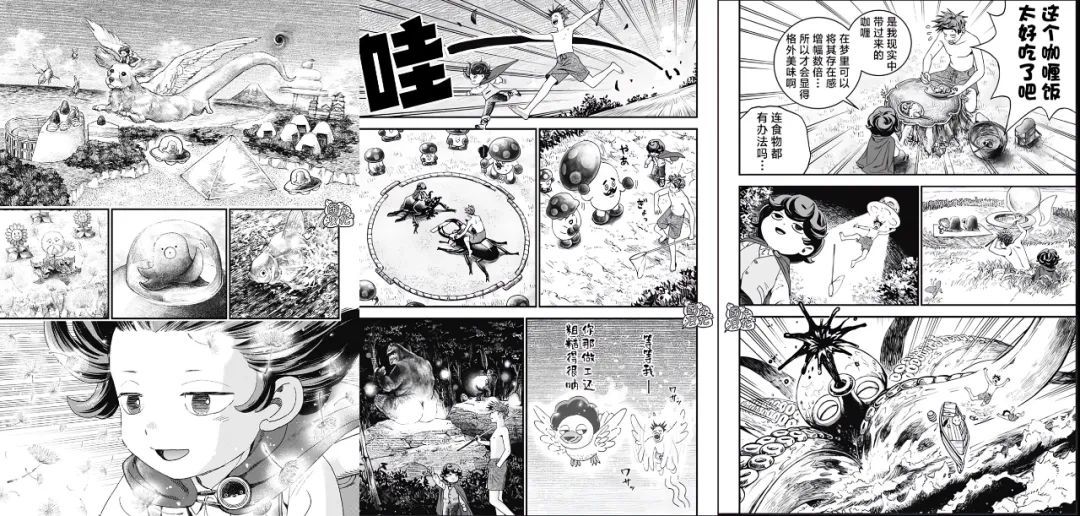 漫画里,当黑堂睁开眼睛,他来到了自己漫画设定集中的奇幻世界。他骑着身披羽翼的大狗在天空自由翱翔,身后是富士山、金字塔、长着巨大饭团的森林、蛋糕制作的古罗马斗兽场。天空遨游的金鱼、乘坐飞碟的章鱼,地上的向日葵向他挥手问好。蒲公英的种子,随着惬意的风,吹拂在黑堂的脸庞。