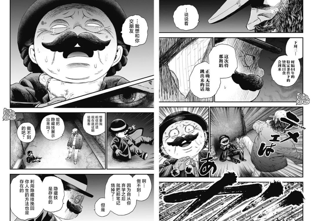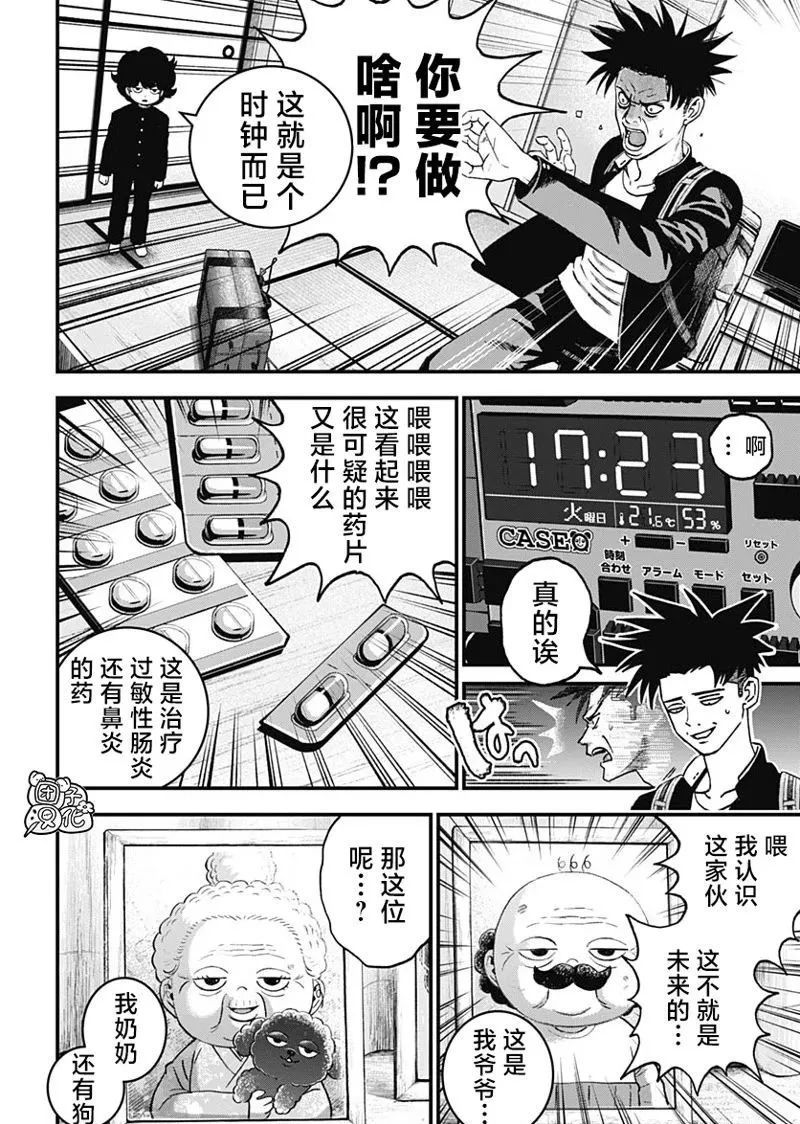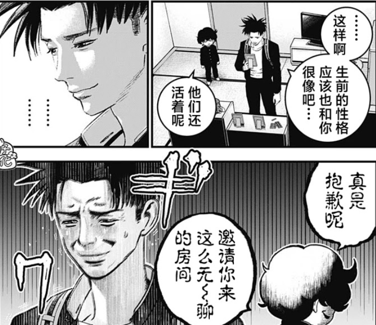 结果下一个分镜,就一脸平静地告诉你这其实是闹钟;看似可疑的药片,则是治疗肠炎和鼻炎的药;相框里的照片,和未来黑堂的长相和气质几乎一模一样(这里后面解释),结果只是爷爷奶奶和家里养的狗;当羊谷以为爷爷奶奶生前的性格也和黑堂一样,马上又得知两位老人还活得好好的。