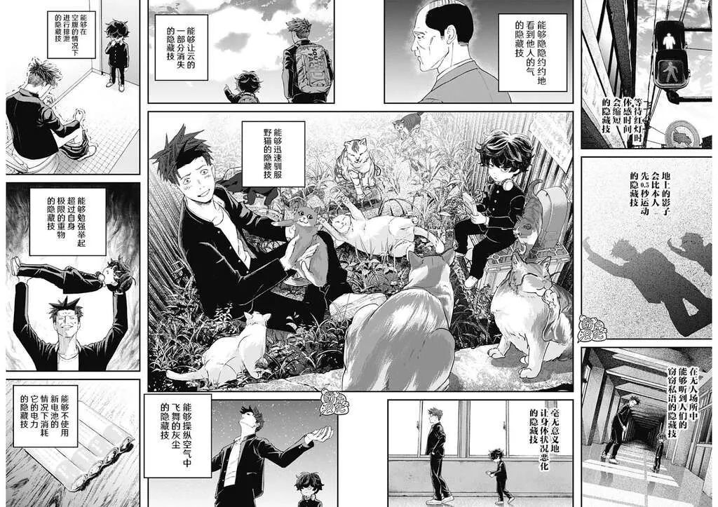 而这样蛮不讲理的隐藏技,黑堂捡到了一整本笔记,上面记载的内容包括且不限于:某地有个永远也不会腐坏的蝉蜕;车站角落有把无法被遗弃的塑料透明伞;让等待红灯的体感时间缩短;地上影子比本人先0.5秒运动;能隐约看到他人气场;让云的一部分消失;能在空腹状态下拉X的隐藏技......