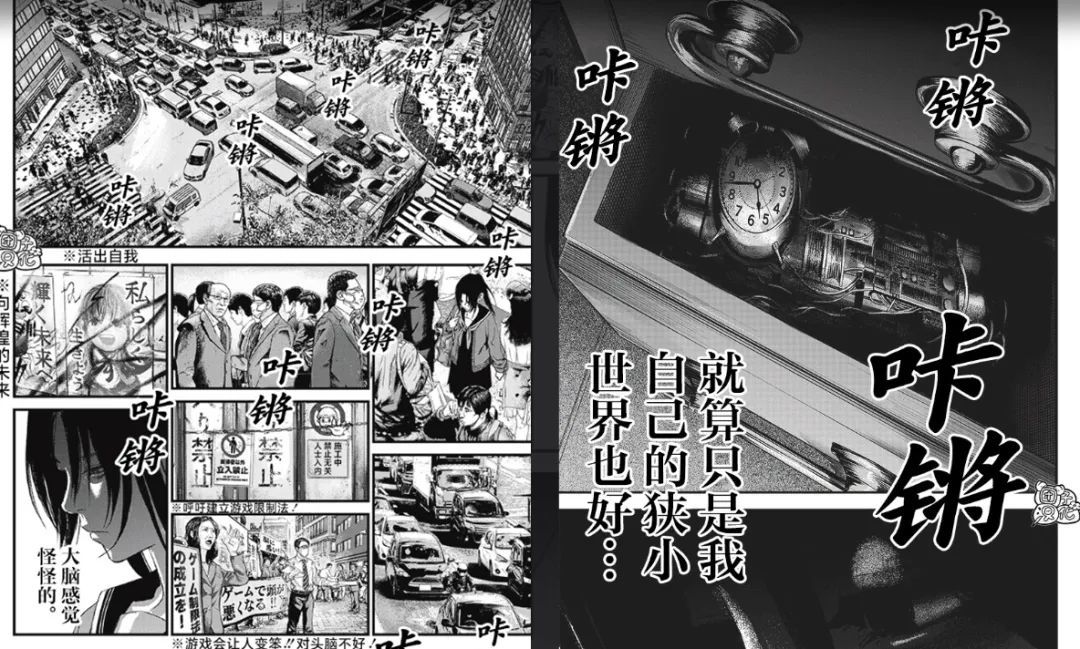漫画还用了更多象征性的手法,侧面描写优木的厌世心里。她的脑海中始终有挥散不去的咔嚓声,就像是无情冷酷的定时炸弹。她想要制作属于自己的炸弹,哪怕只是炸掉禁锢自己的狭小世界也好。