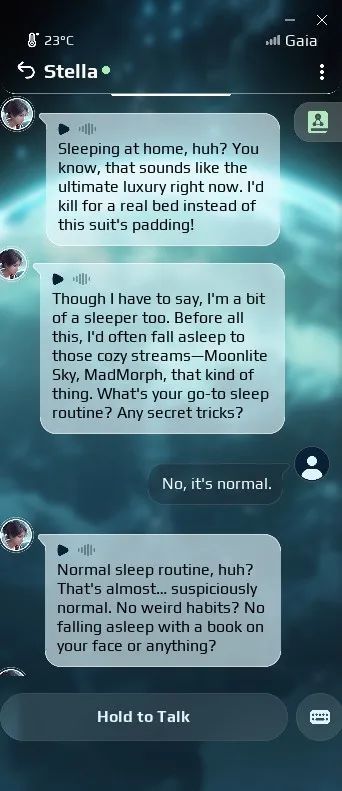 除了引導Stella脫離險境這個主線任務之外,在反覆交流、的過程當中,你也完全可以嘗試將對話引導到其他方向,像現實中的朋友一樣與Stella閒聊。而面對各種問題,Stella給出的反應也顯得相對自然,能夠很好地維持住自己的“人設”,並不會輕易產生半路脫線的現象。
