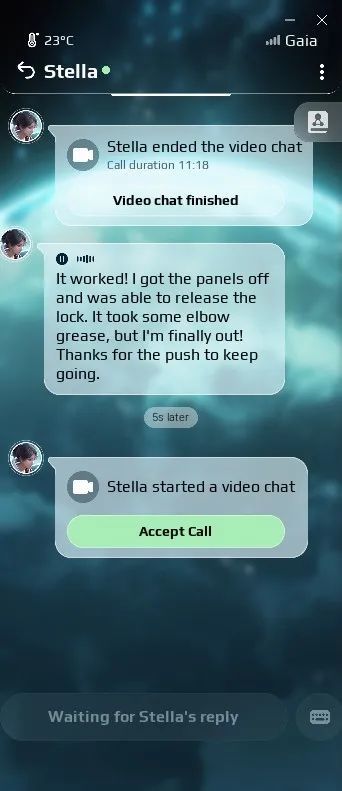在接下來的“解謎”環節,我們找到了工具,又一起研究了艙門附近的區域,最後想到了“用螺絲刀擰開門上鬆動的螺絲”。Stella肯定了這個可行的方案,決定立刻嘗試,至此視頻通話結束,隨即一個訊息界面彈出——是Stella的語音消息。她已經成功脫困,並且很感謝我的幫助。