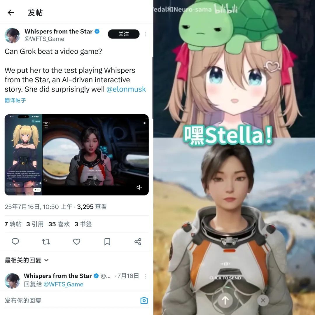 早在之前demo開放試玩的時候,許多海外玩家就已經對Stella進行過“考驗”。比如前不久,Twitch平臺的AI虛擬主播Neuro-sama就在直播裏面玩了《羣星低語》,兩個AI之間從星際探險聊到人工智能,居然慢慢聊出了“惺惺相惜”的感覺;此前馬斯克大推的AI夥伴Grok Ani也被《羣星低語》官方拿來試玩了自家遊戲,還反過來@了馬斯克,向他展示實際效果。