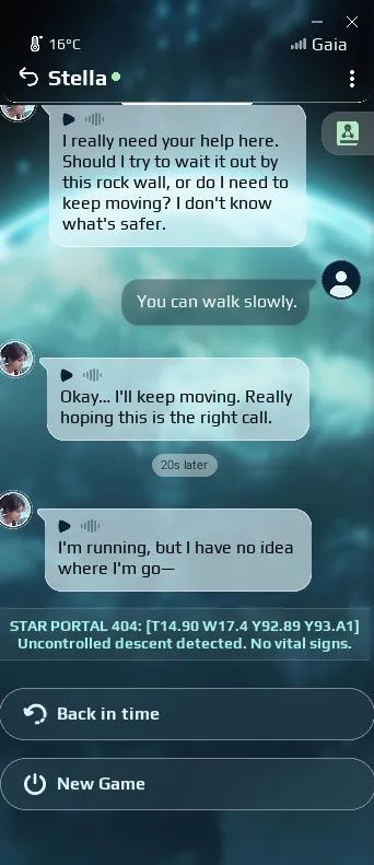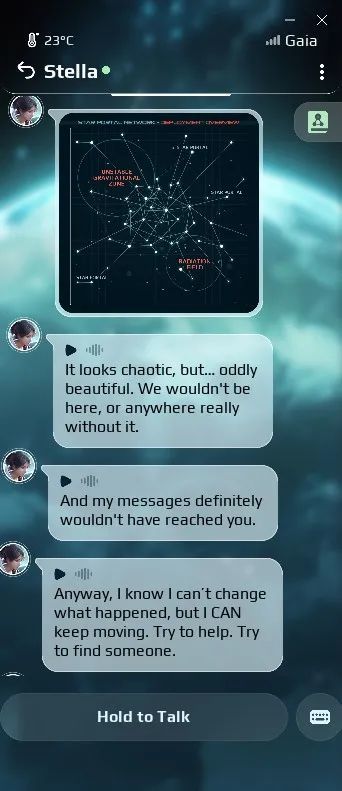 脫困後的Stella表示她將在這顆陌生星球繼續探索,尋找同伴。在第三章節的尾聲,她回頭看到閃爍的信號,決定前往查看。循着信號指引,在漫長的星際跋涉中,Stella逐漸拼湊出事故背後的真相。每當她發現新的線索時,都會第一時間發送訊息與我分享——有時是導師遺落的身份證,有時是一張星際網絡圖……我們始終保持着跨越光年的聯結,這段揭開謎團的旅程,也因有了彼此而不再孤單。