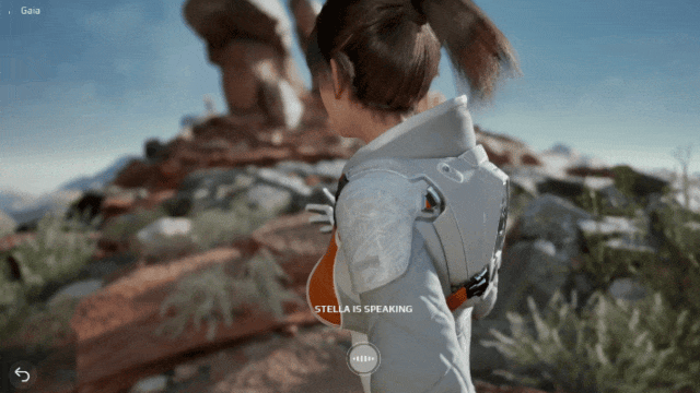 當Stella終於踏足Gaia星球的土地時,她先是對眼前瑰麗的異星景觀欣喜若狂,但思及在飛船上緊急疏散時失散的同伴,很快又變得有點失落。就這樣,在這片廣袤而陌生的平原上,我們開始了漫無邊際的對話。