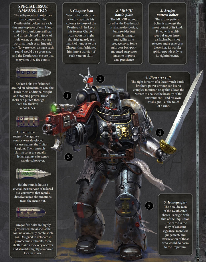 他们立誓为死亡守望服役,期限不定。当这些战士回归原属战团时,会将艰苦获得的知识与战友分享,同时带回专门对抗异形的特种武器装备。