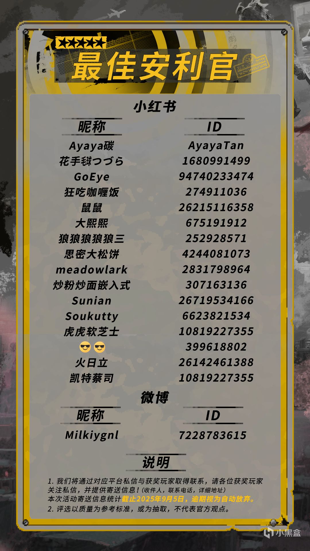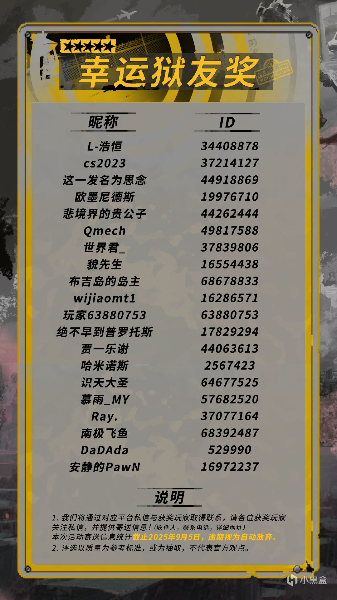 请各位获奖玩家私信小黑盒动物迷城官方号,提供本次活动奖励的收货信息,统计截至2025年9月5日,逾期未提供收货信息则将视为自动放弃。活动奖励将在9月5日后尽快统一寄出,还请耐心等待。