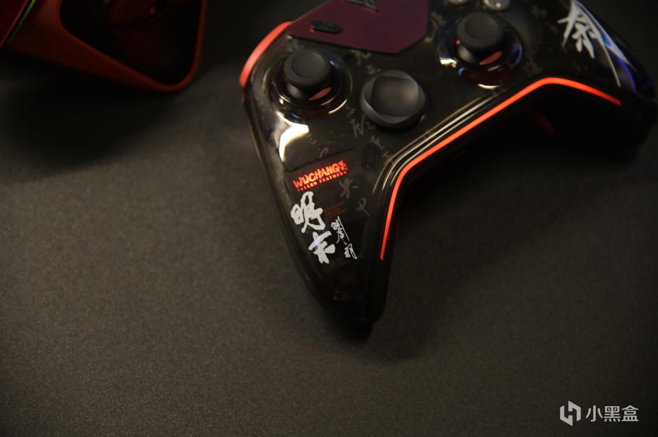 明末的是透明的黑色外壳,右侧手柄下方一个大大的白色“刹”字,左侧握把是明末的游戏logo,上方的屏幕部分是暗红色。
