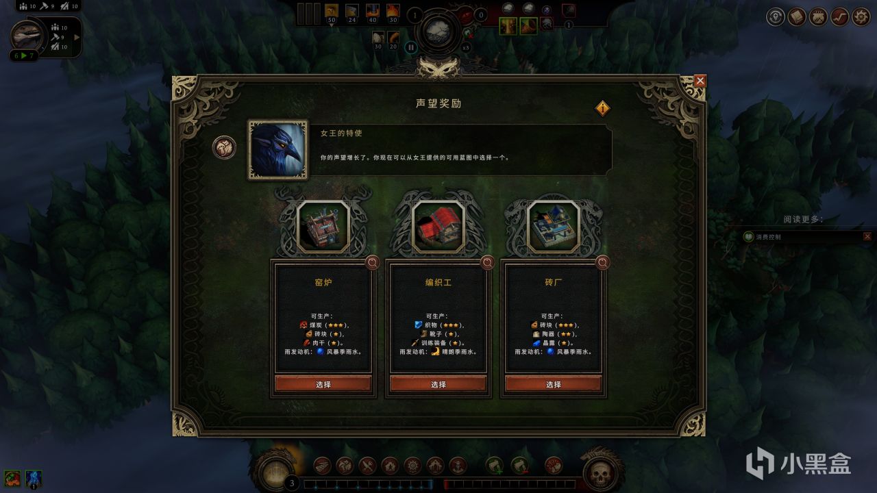 光光有发展肯定是不够的,游戏还加入了森林空地的机制,随着森林的砍伐开发,如果是普通的森林空地,会出现一些资源;而如果是带有骷髅羊头的区域,你会解锁机遇与挑战并存的随机事件。这个事件需要派居民去解决,如果不解决将对定居点造成危害,比如杀死几个居民之类的恶性DEBUFF。而一旦解决了事件,所给的奖励也是非常丰厚的。