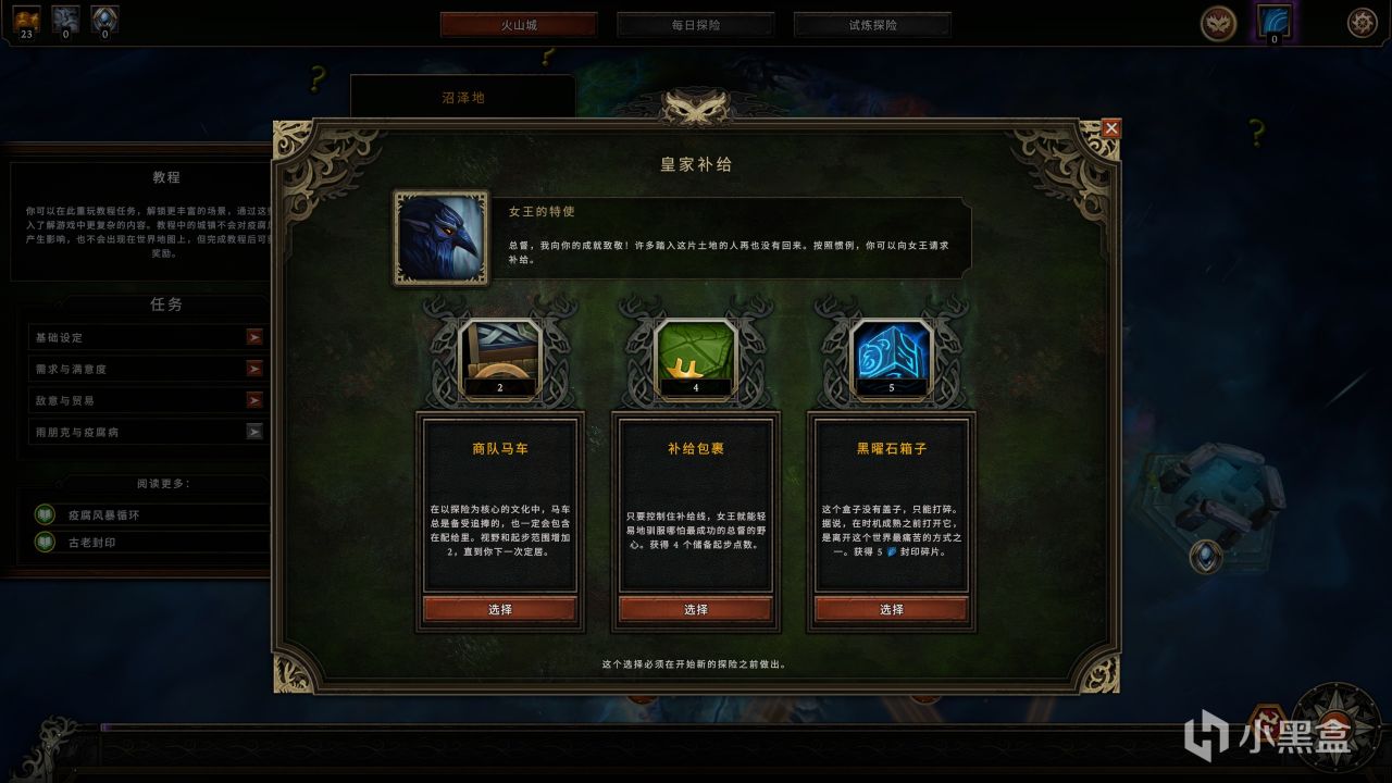 你可以从火山城出发,慢慢将定居点往外面蔓延,而选择一个适合地图的商队,也是玩法策略的体现。每个商队的初始物资和居民的种类数量都有所不同,选择更适合这个定居点的商队,在开局会获得一定的帮助。