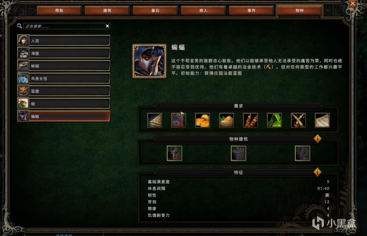 这个种族可以住普通房子和蝙蝠屋,吃饼干、糊糊、烤肉串等,需求打架、教育等,擅长冶金。这些看不出啥,主要是有个被动,奉献“蝙蝠以在其他物种无法承受的环境中生存而自豪,它们不会轻视失败。每有2名其他物种的成员离开或死亡,蝙蝠便获得1点决心。每当有一只蝙蝠离开或死亡,就移除一层奉献效果。”看出来很适合一些极端环境的持续保持,同时第二条被动可以让玩家偏向于养蝙蝠这个单种族而抛弃其他种族来获得一个高满意度的效果。其他属性来看,都比较均衡,算是一个偏中庸的种族。