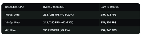 结果显示,在1080p分辨率下,游戏对CPU的依赖性更强,而锐龙7 9800X3D的表现明显优于酷睿i9-14900K。