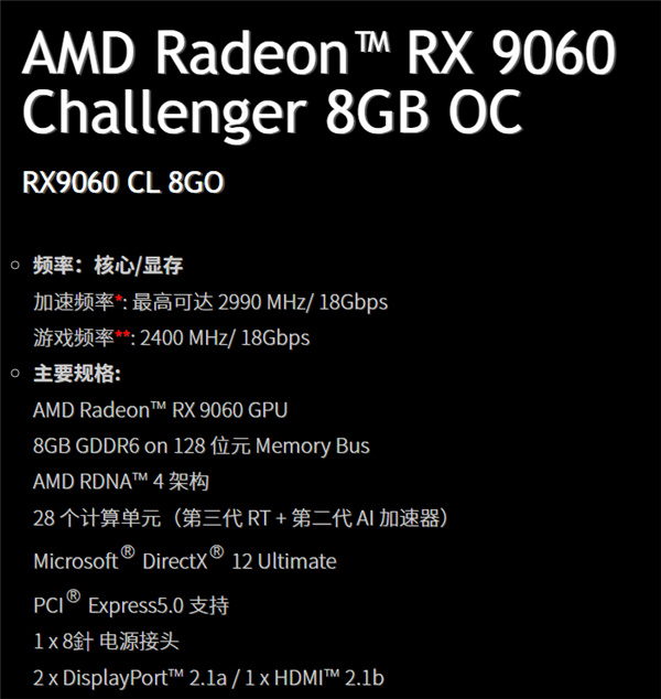 还有个有意思的事,华擎在官网上列出了其首款RX 9060显卡RX 9060 Challenger 8GB OC。