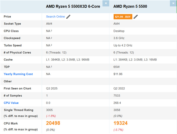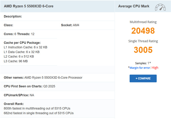 如今这款处理器已经在PassMark测试中现身,结果显示,5500X3D在单核测试中得分为3005分,在多核测试中得分为20498分。