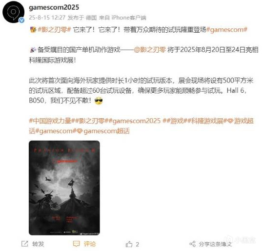 本次科隆展上,《影之刃零》将在 6 号展厅设置 500 平米的游戏体验区,并配备超过 60 个试玩机位。如此大规模的展台,是自 2023 年《黑神话》之后,科隆展上再次出现的超大规模试玩展台,足见其对此次参展的重视程度。