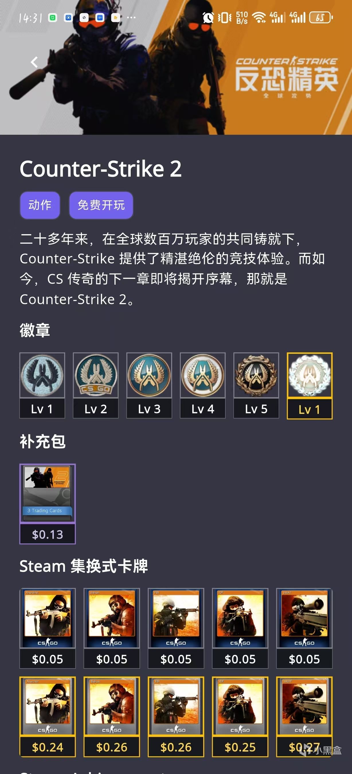 1.大名鼎鼎的cs2,由于其全球大量的玩家,社区市场上徽章合成成本也是steam上价格最便宜的