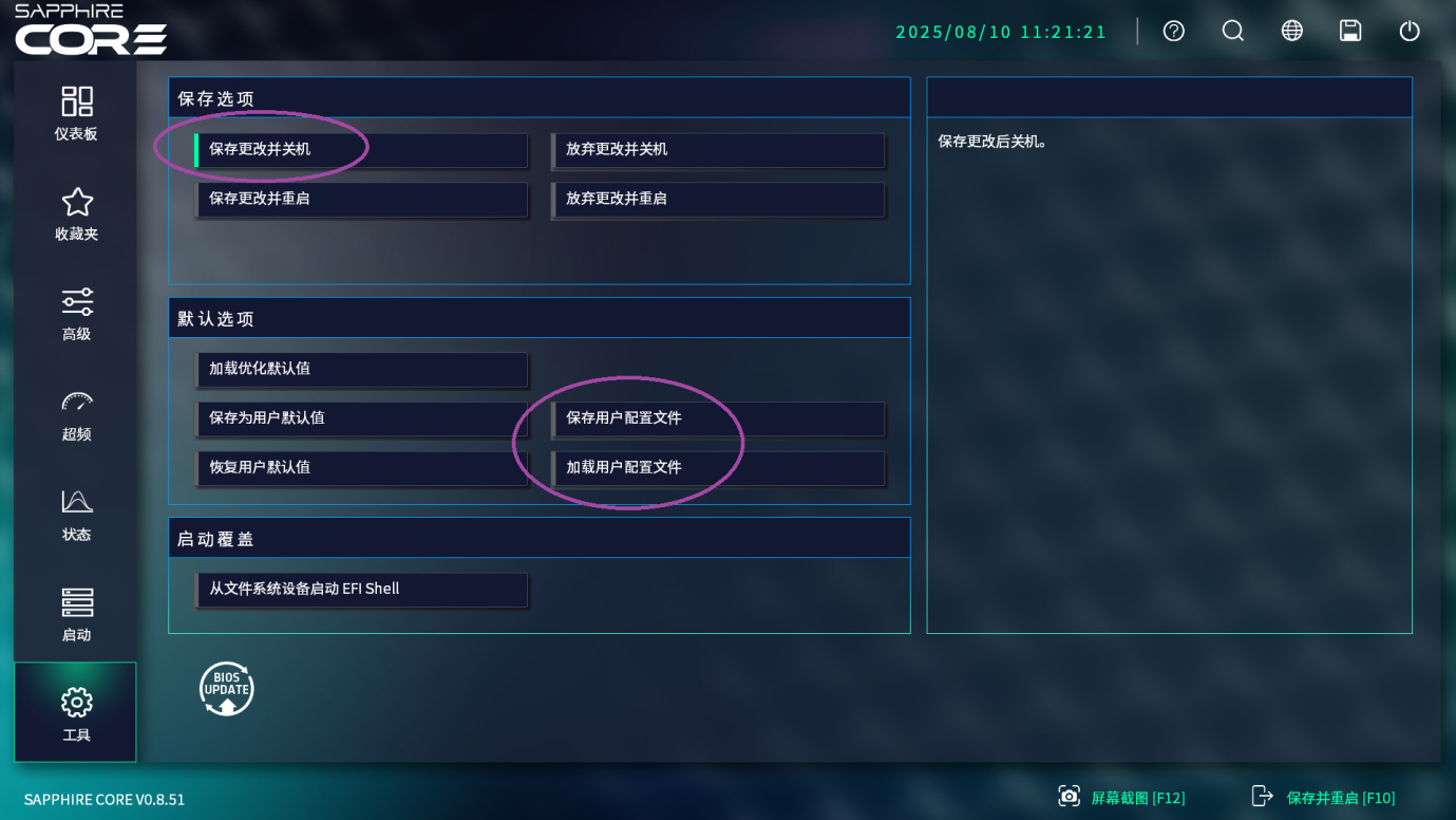 在BIOS界面,增加了传统BIOS没有的一些功能,例如保存更改并关机,同时,可以保存配置文件并分享给他人使用,分享使用更加轻松。