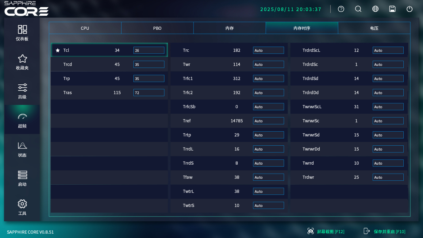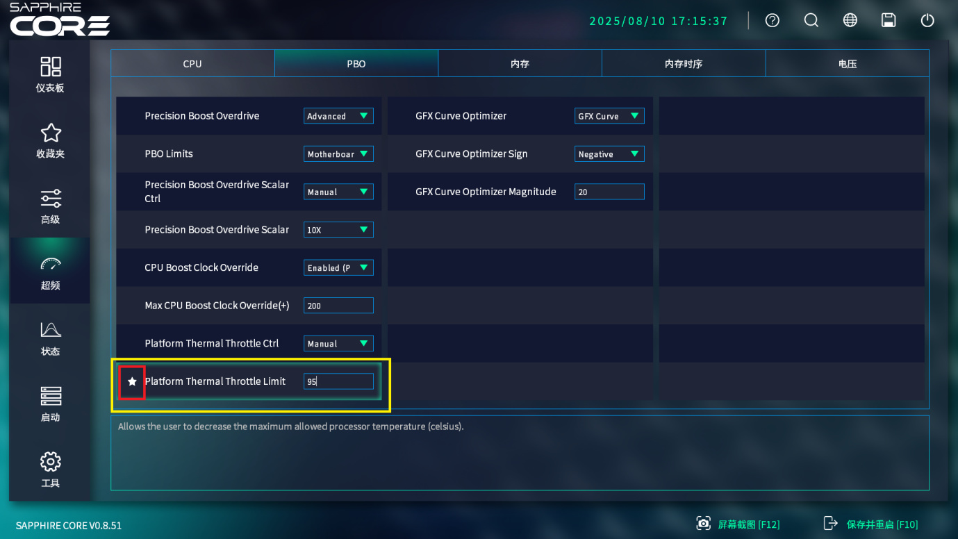 而在超频页面里,分为CPU、PBO、内存、内存时序、电压,同CPU和内存超频相关的设置均在这里,设置起来同样是一个超频页面里就可以解决。你可以找到所有的BIOS选项,而无需和传统BIOS一样,在多个层级里面寻找需要的选项。