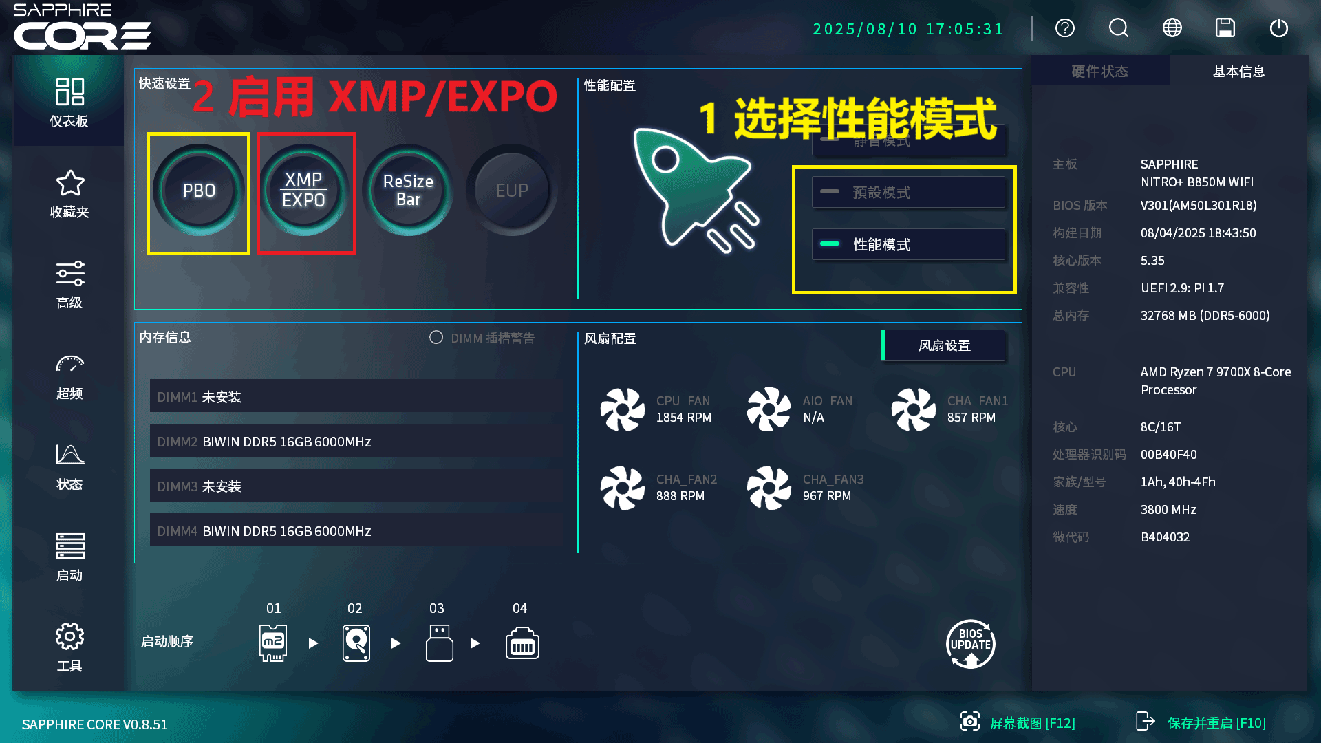 然后我们重启电脑进入到BIOS里面,在默认的仪表板页面里,首先将性能配置里的预设模式点击选择变为性能模式,此时我们看到左侧的快速设置里PBO按钮也自动的选择了。然后再点击XMP/EXPO启用内存的这个超频功能。然后按F10保存重启电脑,我们来看下有哪些提升。