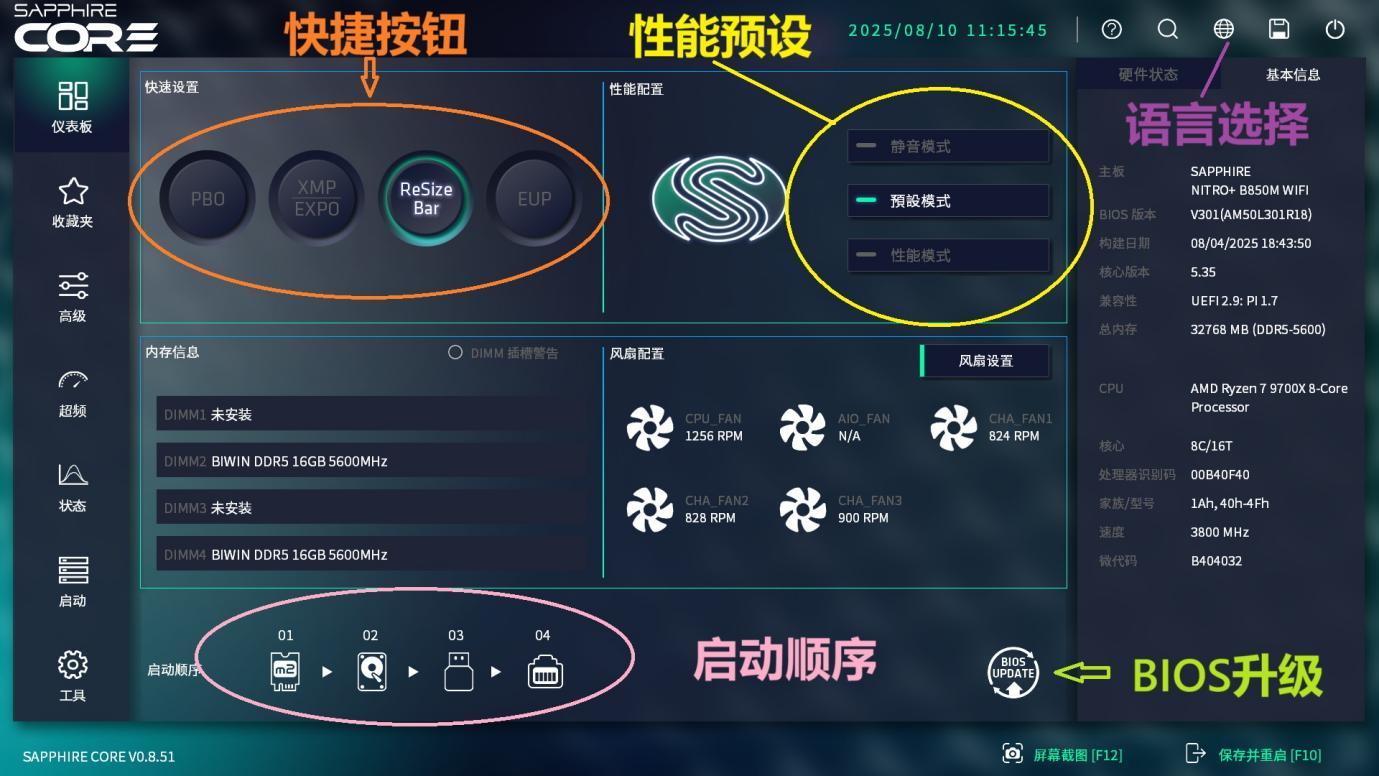 右上角的图标可以选择界面语言。中间四个方框, 第一个快捷设置可以轻松选择4个不同按钮功能,第二个是性能配置,默认是预设模式,可以在静音模式和性能模式之间选择。下面的2个方框分别是显示内存状态和风扇状态,其中风扇状态里有风扇设置 按钮。画面右侧,则是系统的基本信息。可以看到主板型号、bios版本日期,CPU信息等。在界面的下方左侧,可以选择系统启动的硬件顺序,而在右侧,有个BIOS升级按钮。