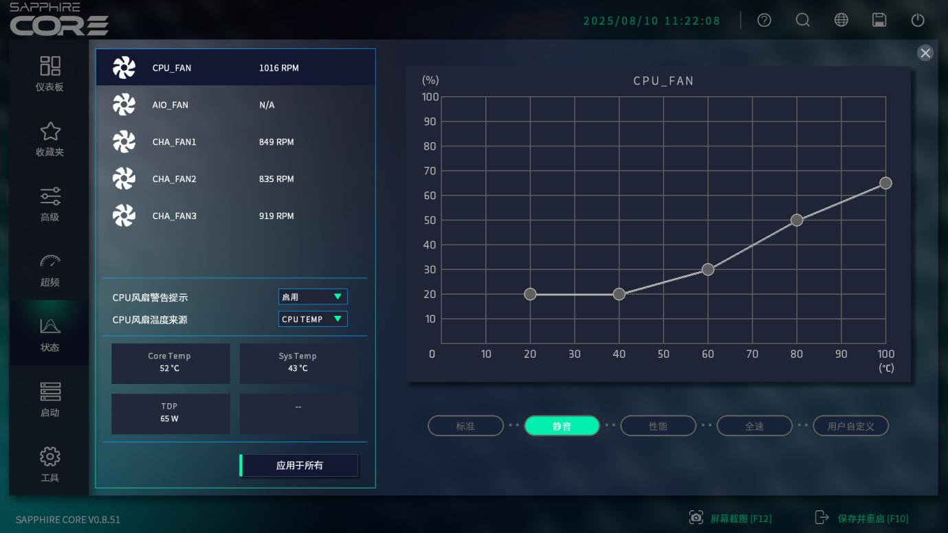 风扇设定也是电脑里很重要的部分,有的人注重安静,有的人注重性能。蓝宝石主板新的BIOS界面里,这里可以更加简单的看见预设的四种模式,标准、安静、性能、全速,以及用户自定义模式,可以更加随心所欲地设置风扇控制曲线。