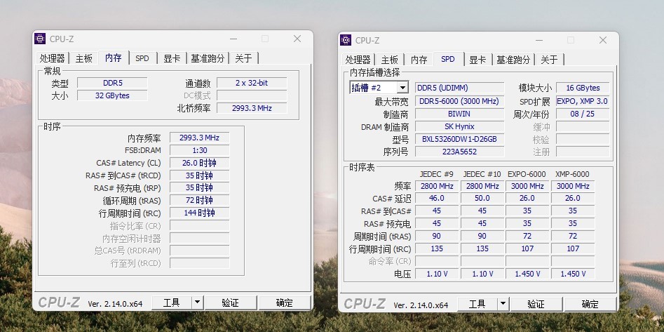 首先我们运行CPU-Z,我们看到内存已经从默频5600MHz变成了6000MHz,时序是CL26。