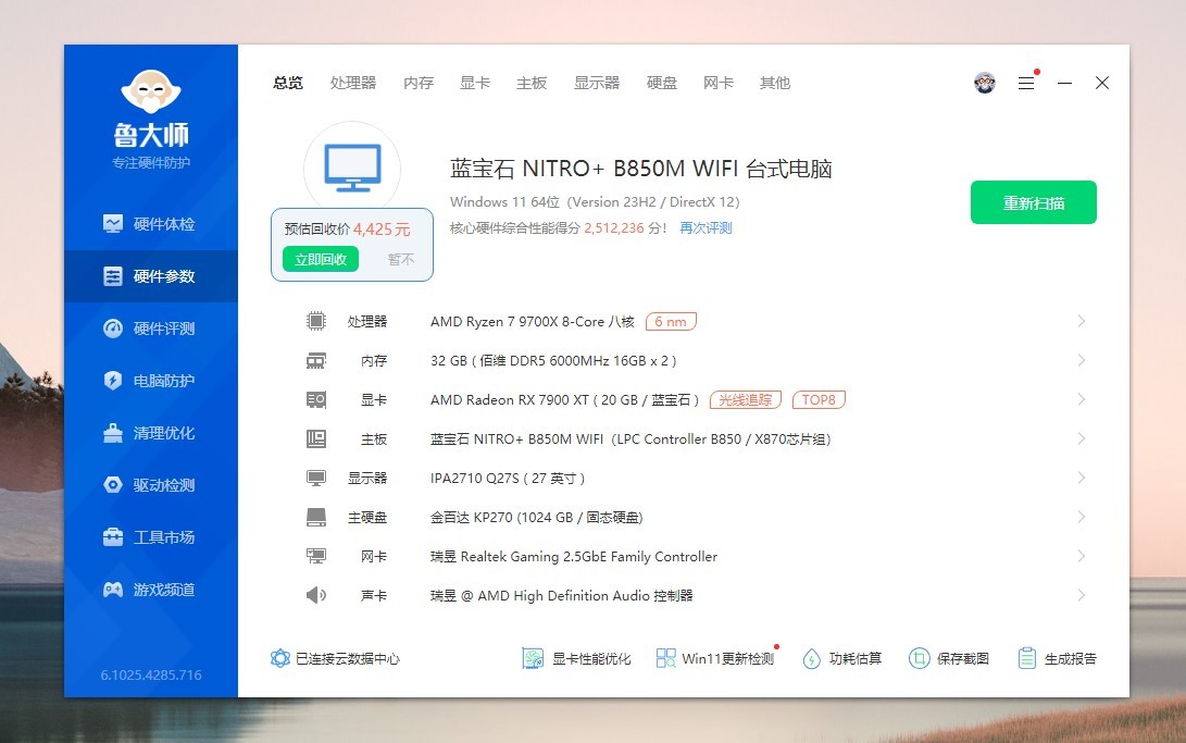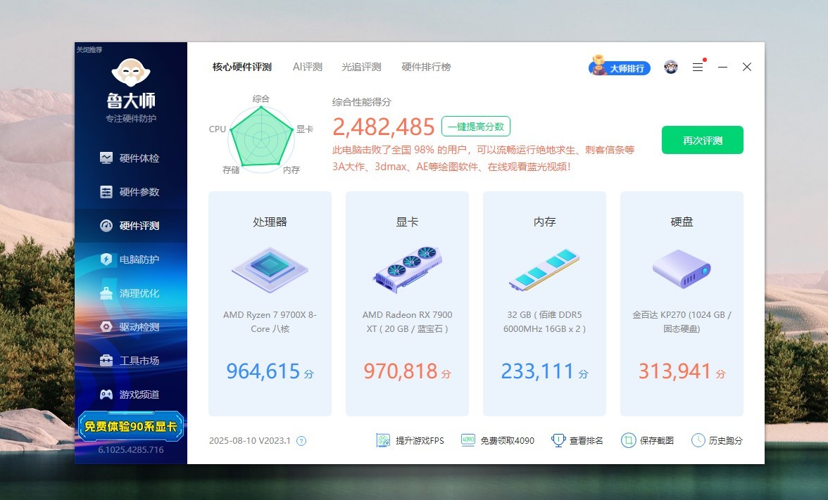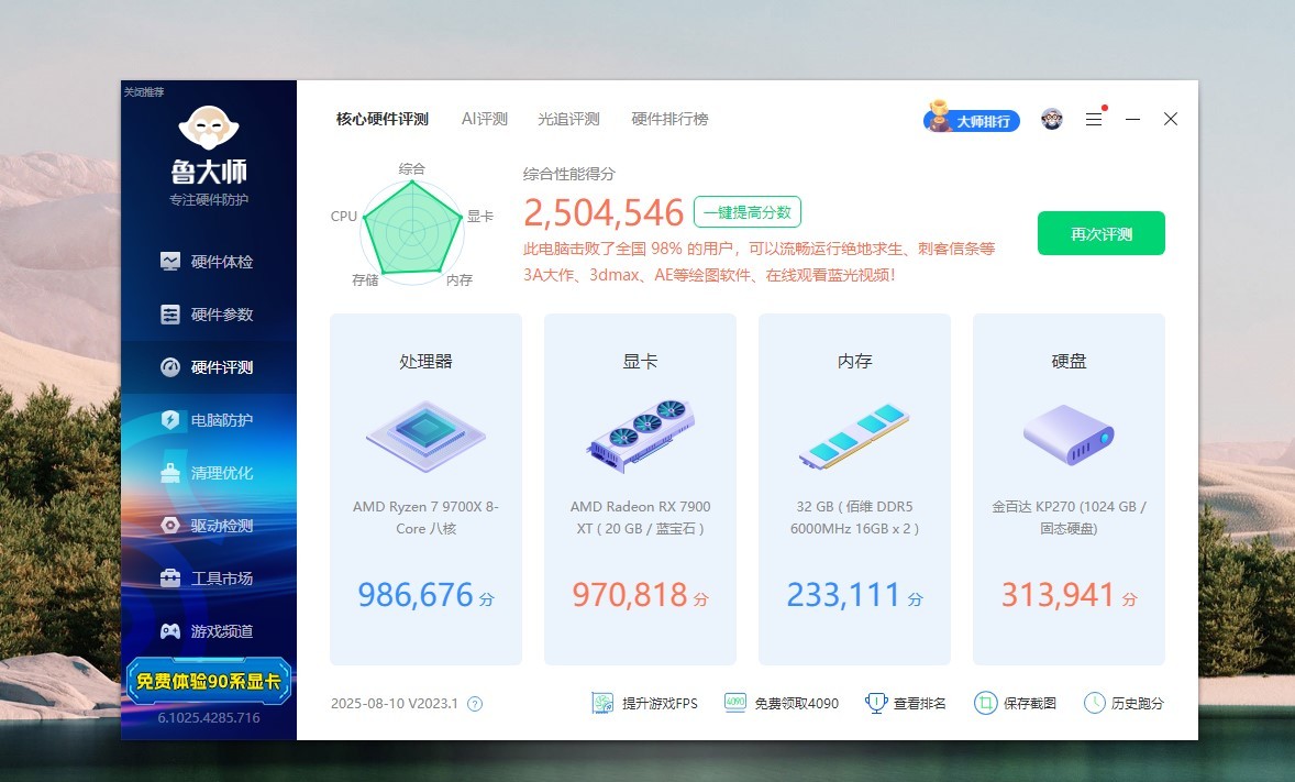 运行鲁大师看下配置,我们看CPU是AMD R7 9700X,内存是佰维DDR5 6000MHz,显卡是蓝宝石 RX 7900 XT极地版,主板是蓝宝石NITRO+ B850M WIFI氮动,硬盘是金百达KP270。