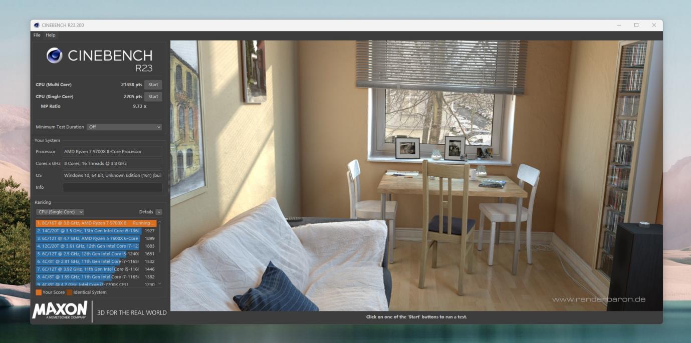 CINBENCH R23测试,多核21458,单核2205,提升前多核19510,单核 2176,我们看多核提升了9.98%。