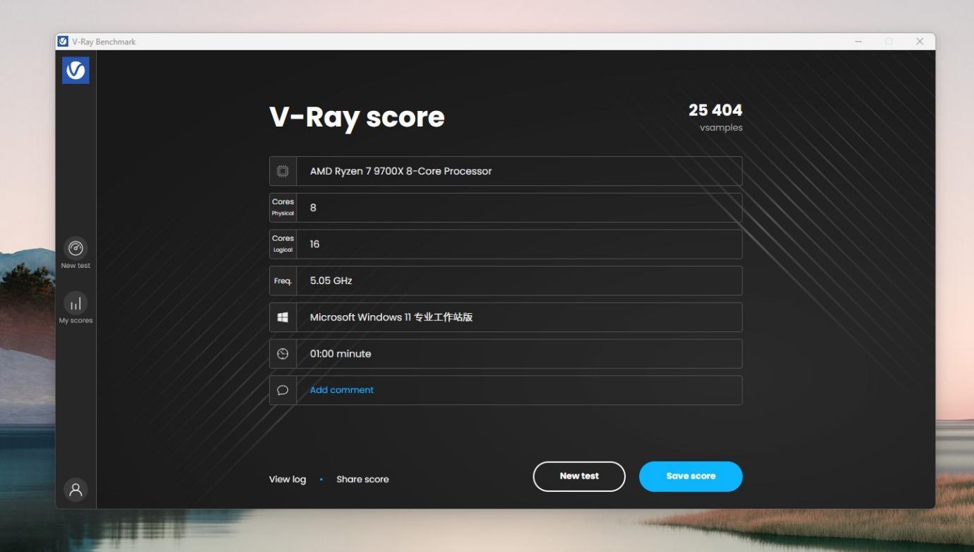 V-RAY 测试,总分25404,同样是比一键性能模式时 略有提升。