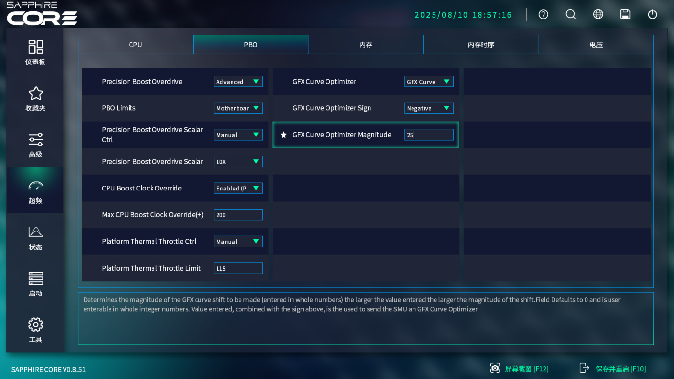 举一个简单的例子,以AMD的PBO超频为例,以前的PBO超频分别在不同的页面,而且要在一大堆不同的设置里面挑选PBO相关的内容,繁多而不变。现在同PBO相关的参数,在一个页面就可以设置完成,其他无关的都不会出现,真不错。上图就是我进行了PBO手动简单设置后,进行CPU超频的一个设置,我们下面来看下这种配置下的结果如何。