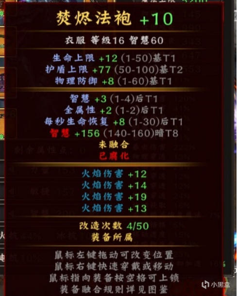 最后就是装备了。装备的强度也算比较好分辨,颜色代表等级,有属性和等级限制,属性词条按t级划分。当然,经过我的尝试,我发现了关于装备两个比较好用的小tips:例如一件需要智力的装备本身会增加智力属性的话,可以先点到可以装备的值,穿上之后再将智力属性减到装备要求的数值,装备不会脱下来。