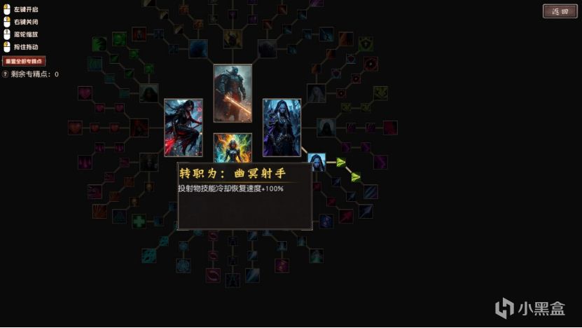 天赋有着非常大一页天赋树,一眼看上去可能会觉得头晕目眩找不到重点,但是仔细一看就会发现实际上采用的还是由小到大的这样一种模式,每一条分支都有一个最后的特殊能力,只需要找到自己想要的能力朝着这边点就好了。游侠当然选择投掷物伤害,直接点过去。