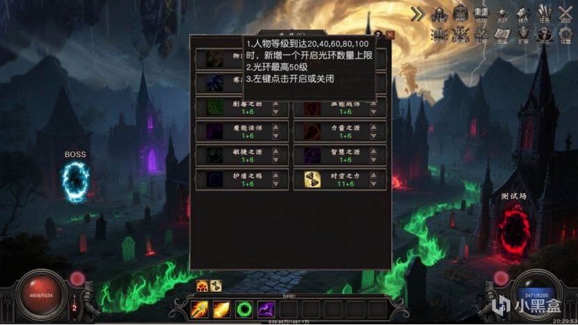光环效果则是比较简单的全局加成,这里我选择火属性伤害和随游戏时间加成的伤害加成。