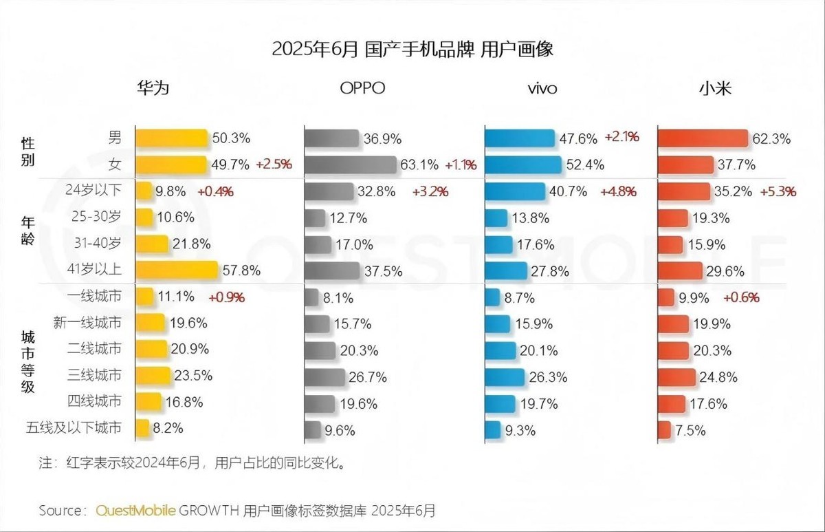 手机厂商的活跃设备数量是一个非常重要的指标,直接体现品牌在市场中的用户规模。近日QuestMobile发布2025中国手机市场洞察报告,截至2025年6月,华为手机活跃用户高达2.88亿,超越苹果排名第一,苹果手机活跃设备数量2.71亿位居第二,OPPO手机活跃设备数量2.33亿排名第三,vivo手机活跃设备数量1.93亿,小米手机活跃设备数量1.21亿,荣耀手机活跃设备数量0.97亿。