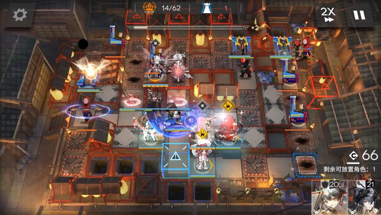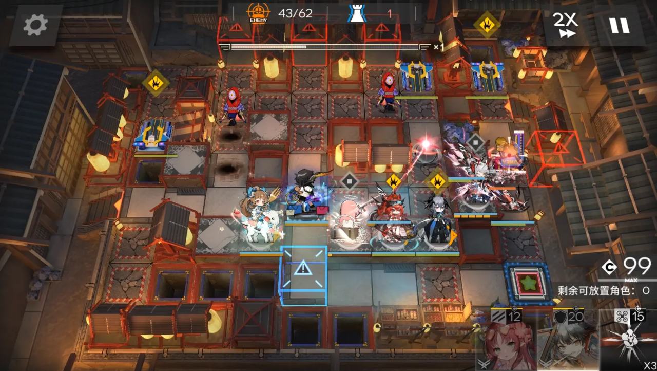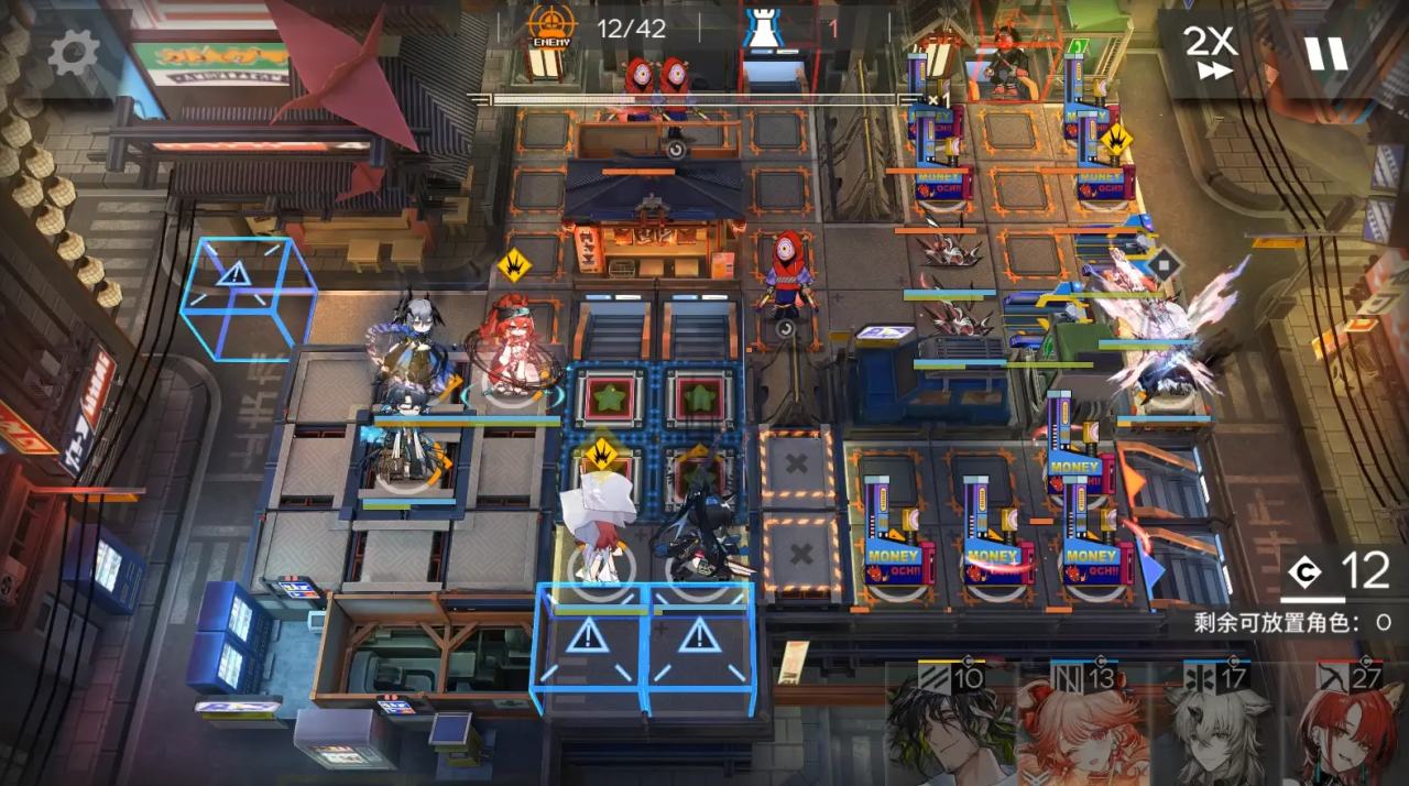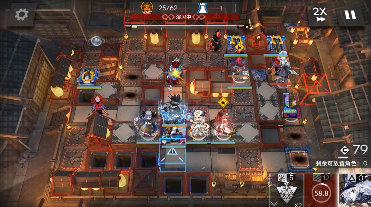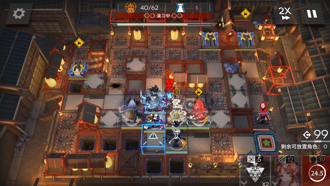 開局桃金娘在藍門右邊一格,部署棘刺朝上,大姨朝右,等大姨右邊那個轉圈的怪到拳擊機器人那邊開那一排的裝置。夜鶯朝左。lgs朝右。餅乾朝上。