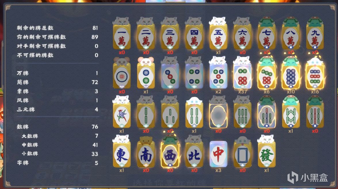 這把我們的終極目標就是要胡以789筒爲核心的全大清一色,可以看到,爲了彌補摸牌數難刷的缺點,我給九筒附上了幽靈,這樣每次摸到九筒總摸牌數都能+1(加槓摸的或者夢狸變的都能觸發),最終的效果就是讓我們的可行動回合數與牌堆剩餘牌數相等