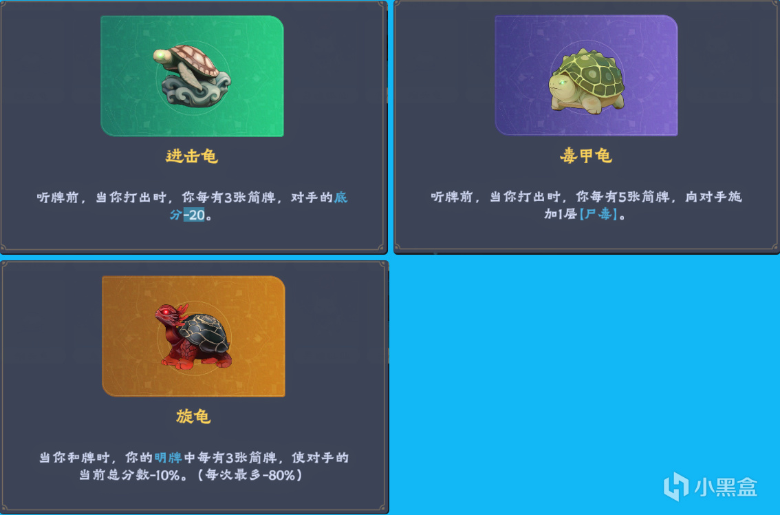 筒子的幾個龜龜和手銬流的相性非常好,我們多次摸牌多次出牌的特性可以反覆觸發上面這幾個龜龜,所以開局拿到龜龜的話就可以考慮以筒牌爲核心進行構築了,走筒的話最好同時走四槓,通過加槓讓龜龜的數值進一步飛躍