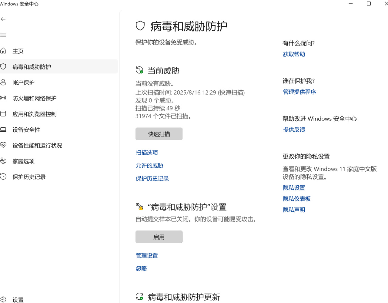 2.在右侧找到 病毒和威胁防护,点击进入。