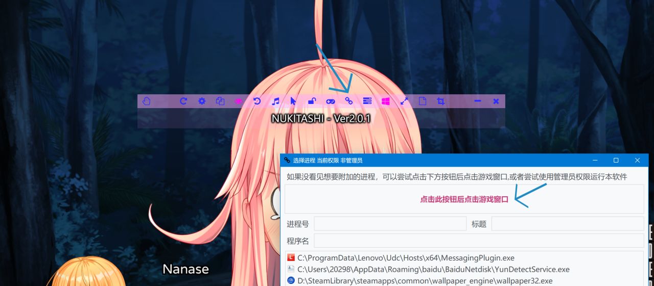 在 LunaTranslator 工具栏点击「选择游戏」按钮(图标为链接状)