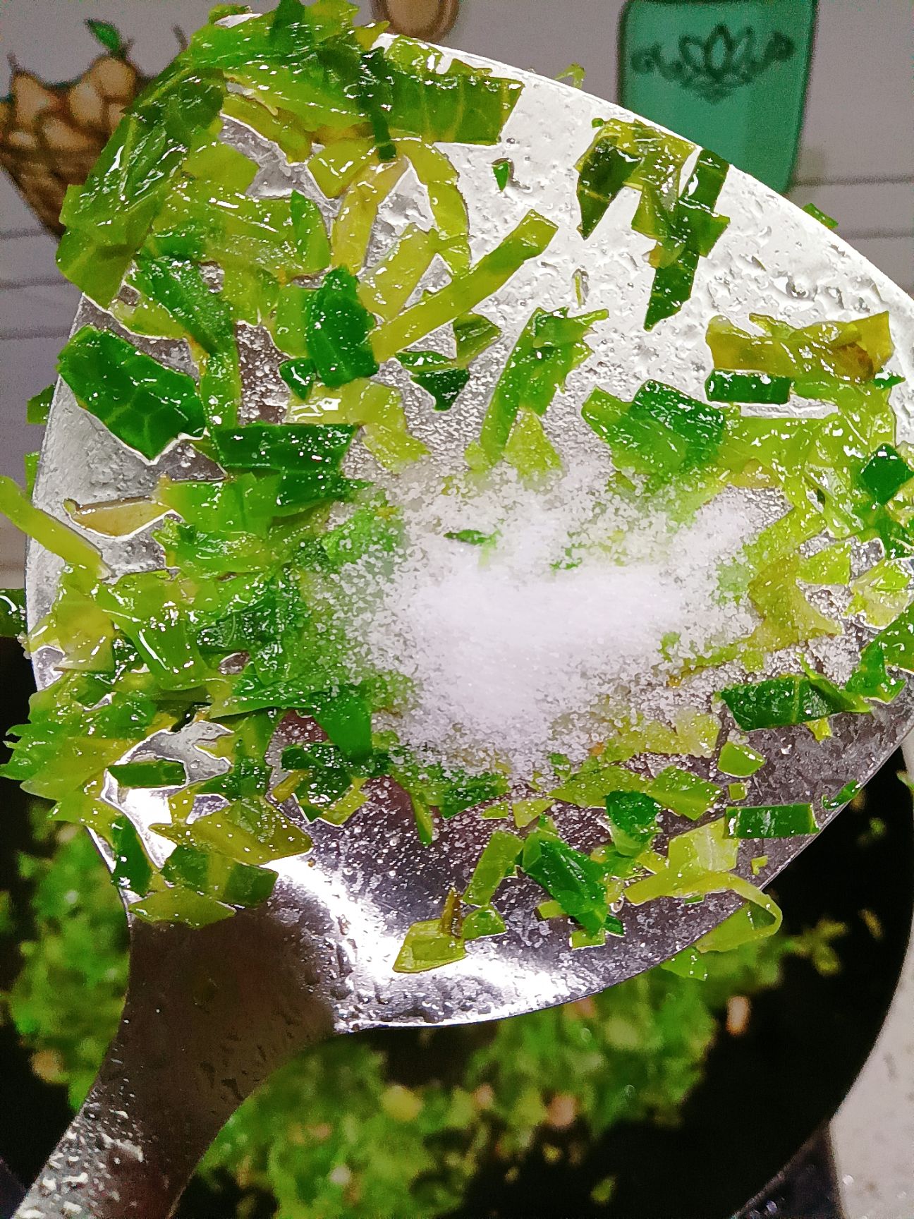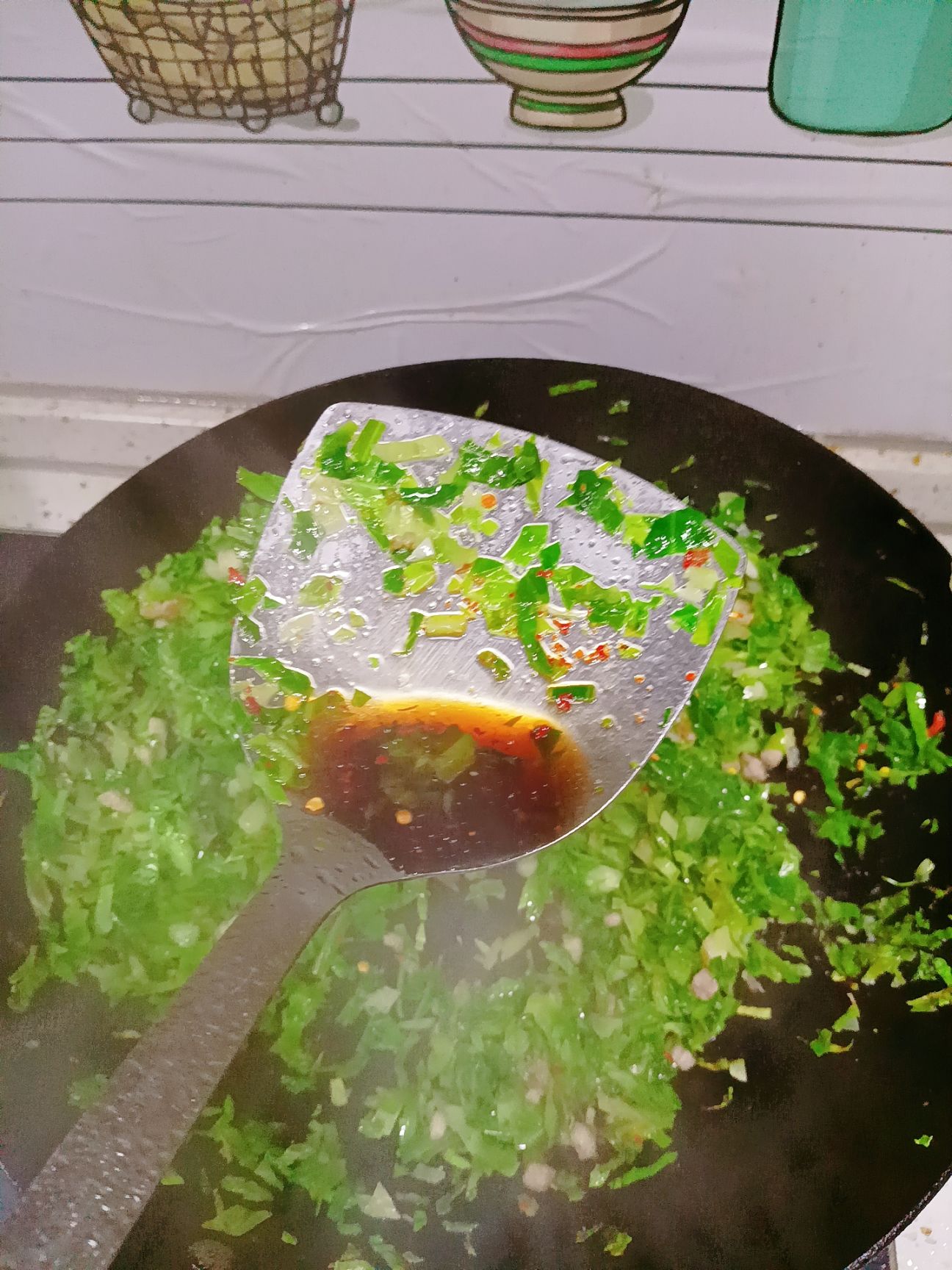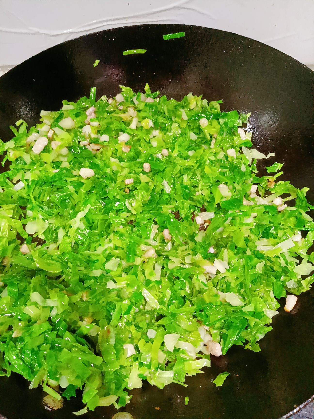 包菜切碎。鍋中無油炒幹水分,我這是做2餐喫,一般2個人喫飯,老包菜用到6-7枇就可以了。